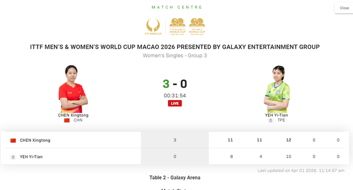 28岁的陈幸同在2026国际乒联单打世界杯保持了稳健的状态,她在继小组赛第一战3比0击败德拉戈曼之后,又在第二战3比0击败叶伊恬,从而两战全胜出线,挺进了16强。